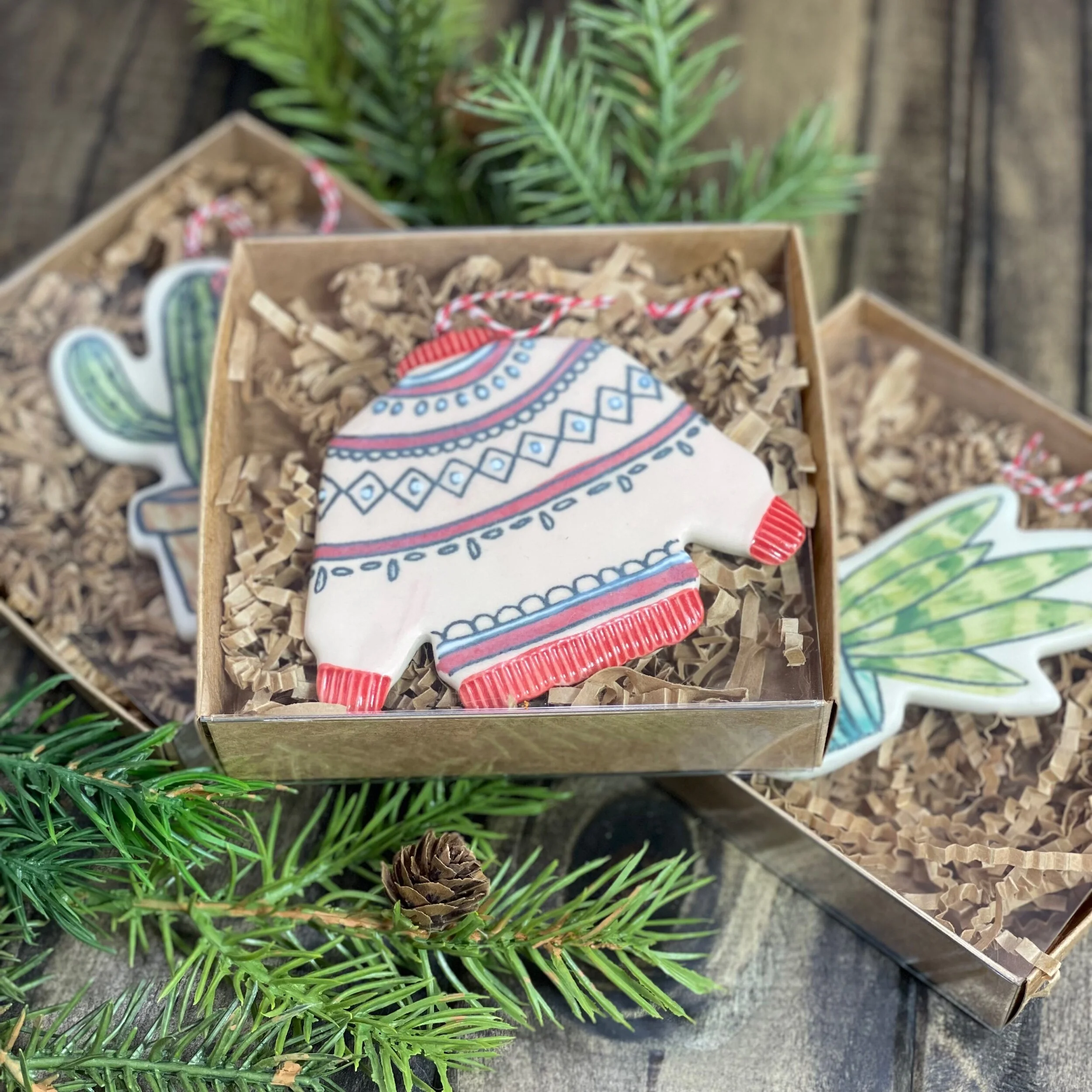 A handmade ornament for your holiday decorating! Each design is an original illustration silkscreened onto clay then hand painted with unique details. Ornaments are packaged in a clear topped box ready for gift giving!